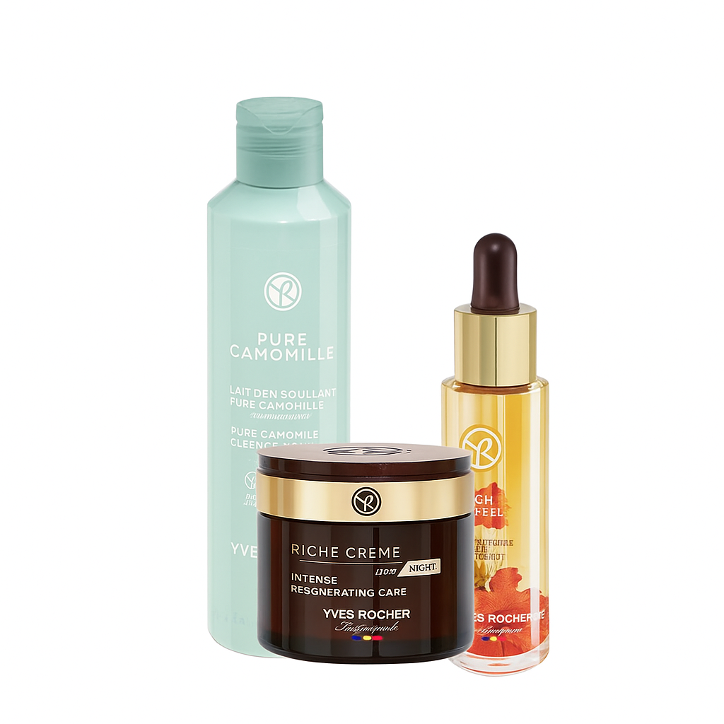 Tri proizvoda koji zajedno čine savršenu rutinu: čišćenje, umirenje i intenzivna obnova kože – za blistav, nahranjen i vidljivo zaglađen ten.