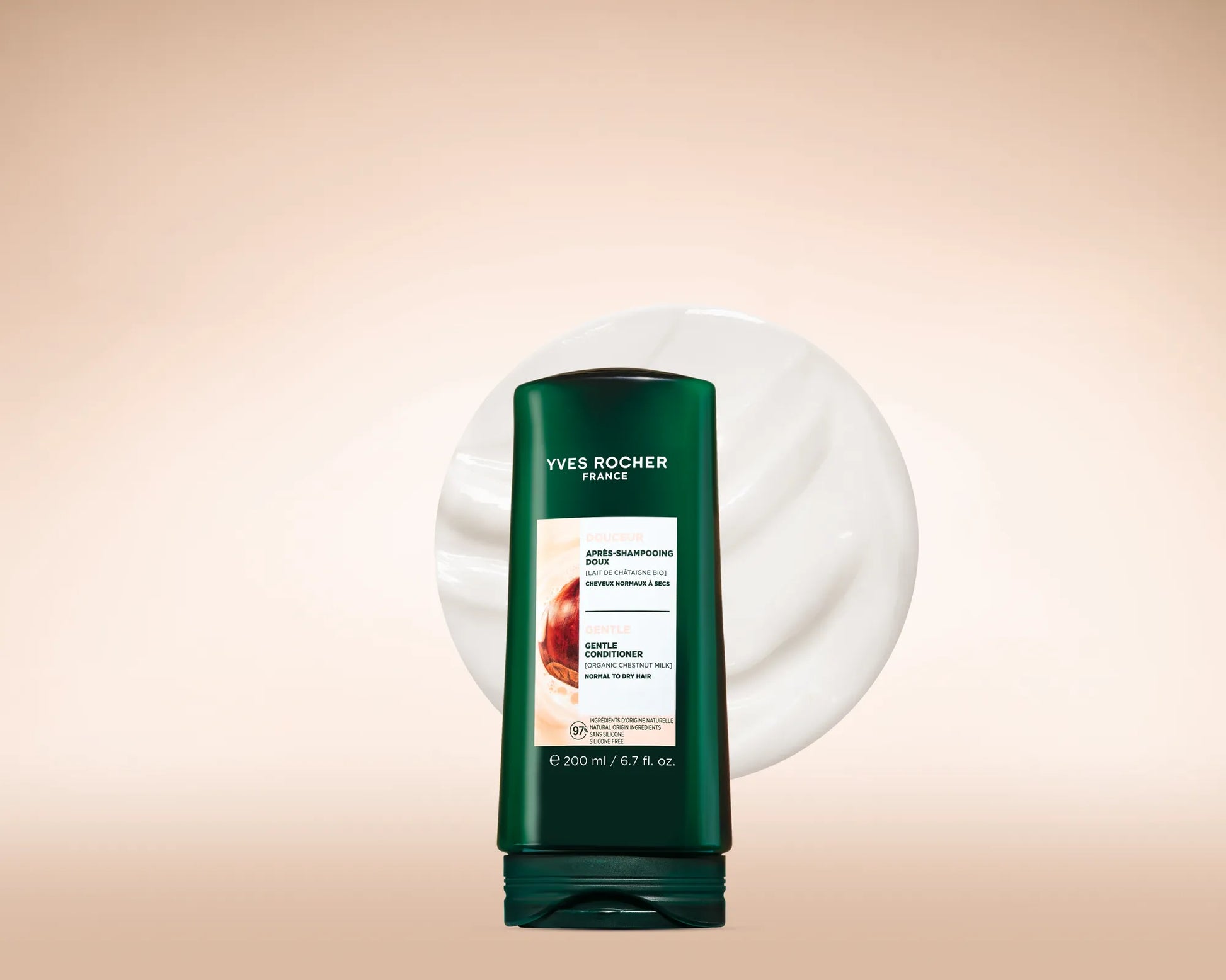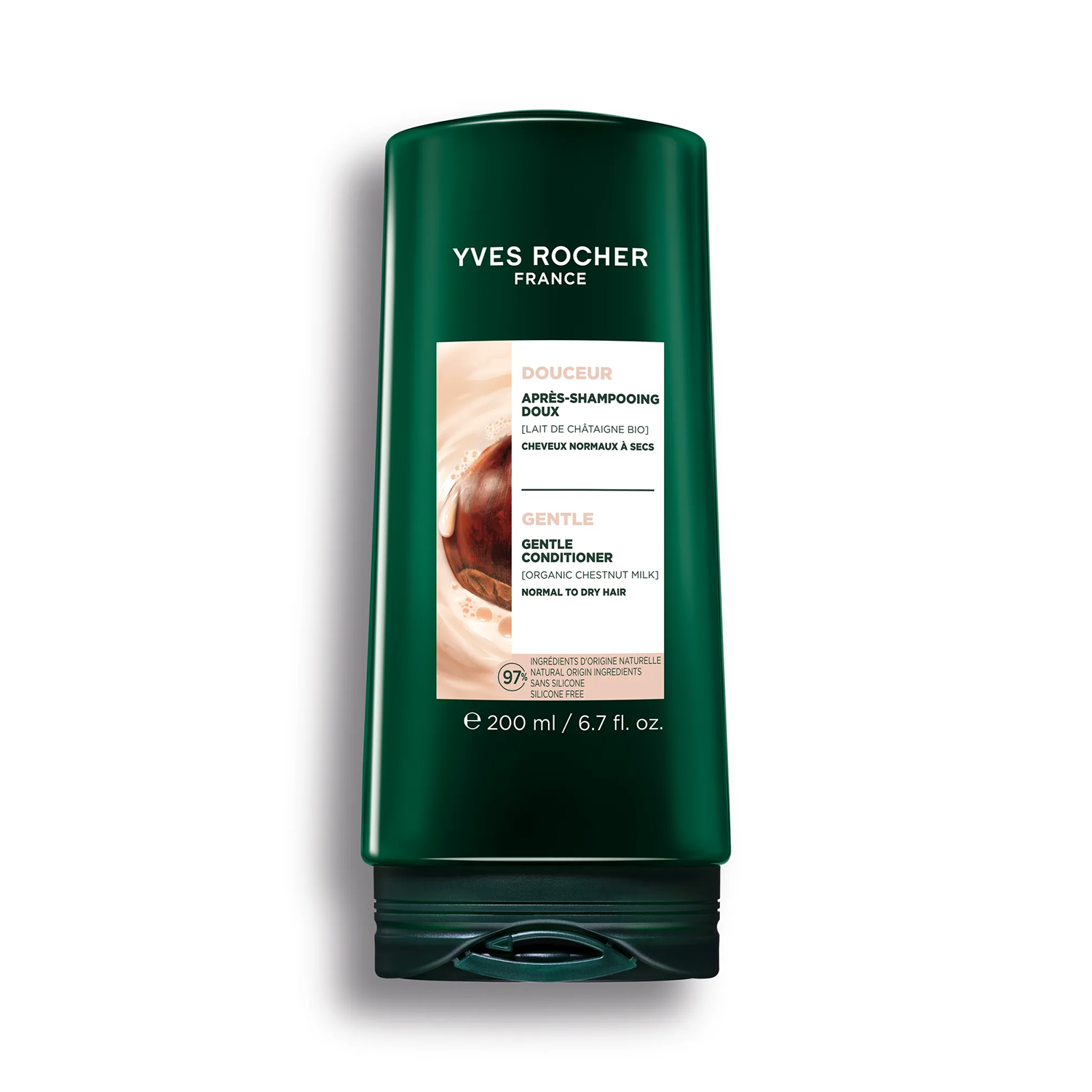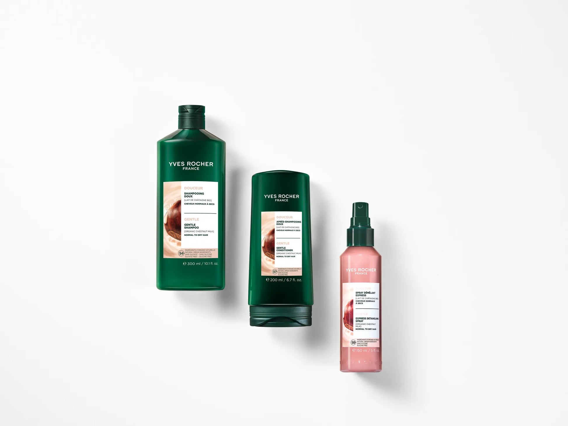 Istraživači iz Yves Rocher Laboratorije biljne kozmetike® izabrali su mleko od kestena zbog njegovih nutritivnih svojstava — inspirisani njegovom moći da hrani i omekša, stvorili su liniju za blagu negu kose normalne do suve teksture.