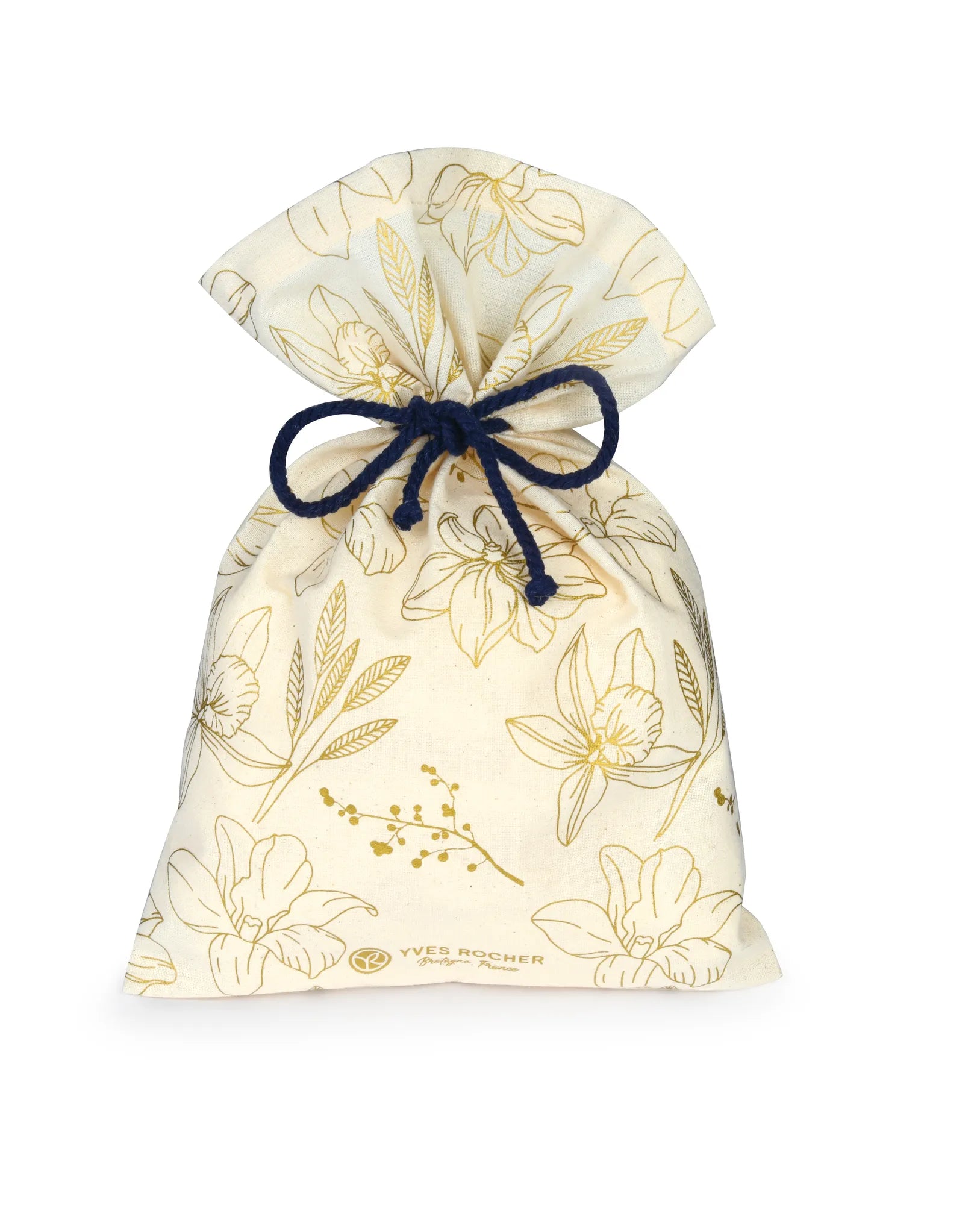 Ova nežna platnena vrećica brenda Yves Rocher donosi dašak prirodne elegancije svakom poklonu. Ukrašena zlatnim cvetnim motivima i zatvaranjem na plavi učkur, idealna je za pakovanje kozmetike, nakita ili sitnih poklona. Višekratna i praktična, može se koristiti i kao dekorativna torbica za odlaganje dragocenosti.