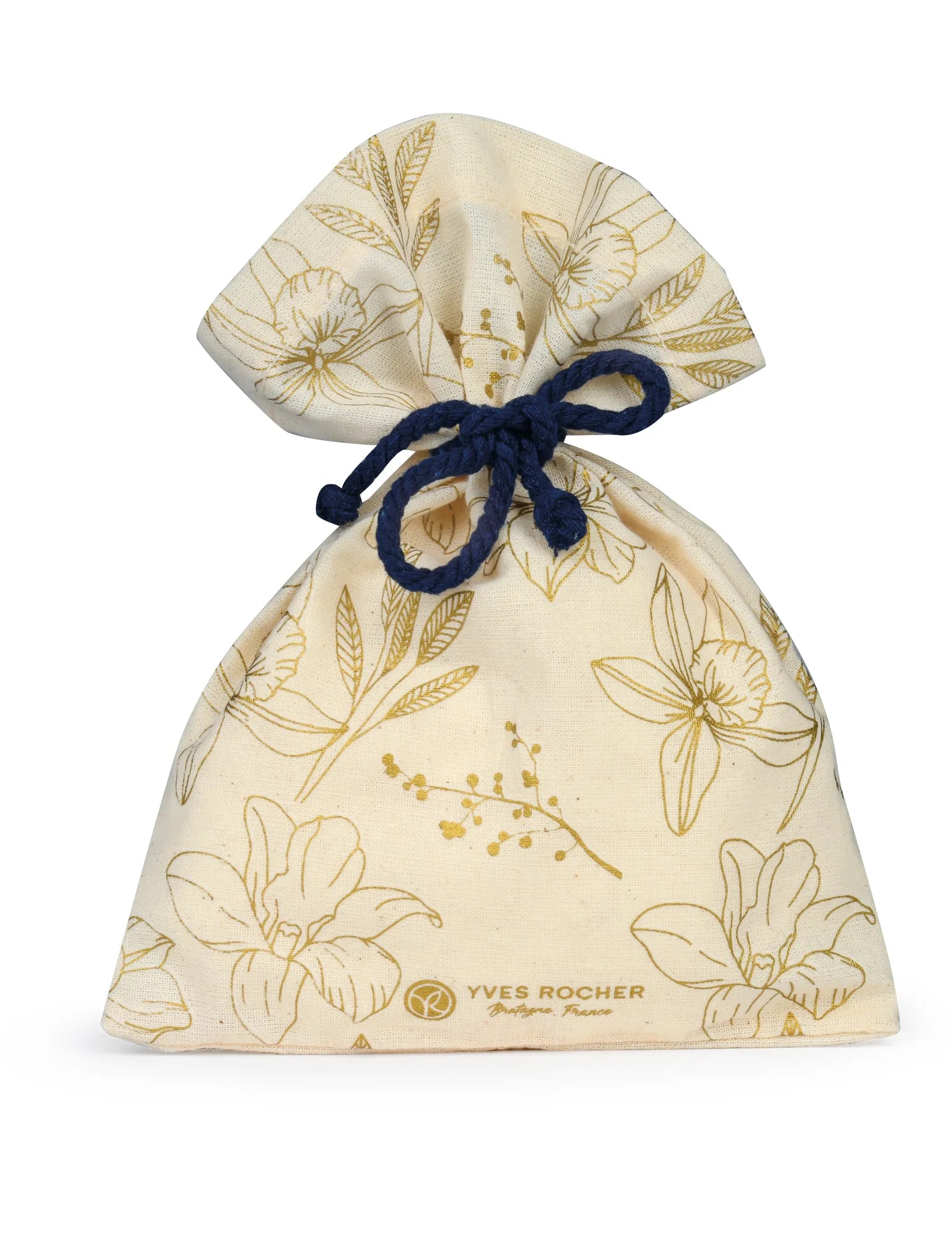 Ova nežna platnena vrećica brenda Yves Rocher donosi dašak prirodne elegancije svakom poklonu. Ukrašena zlatnim cvetnim motivima i zatvaranjem na plavi učkur, idealna je za pakovanje kozmetike, nakita ili sitnih poklona. Višekratna i praktična, može se koristiti i kao dekorativna torbica za odlaganje dragocenosti.