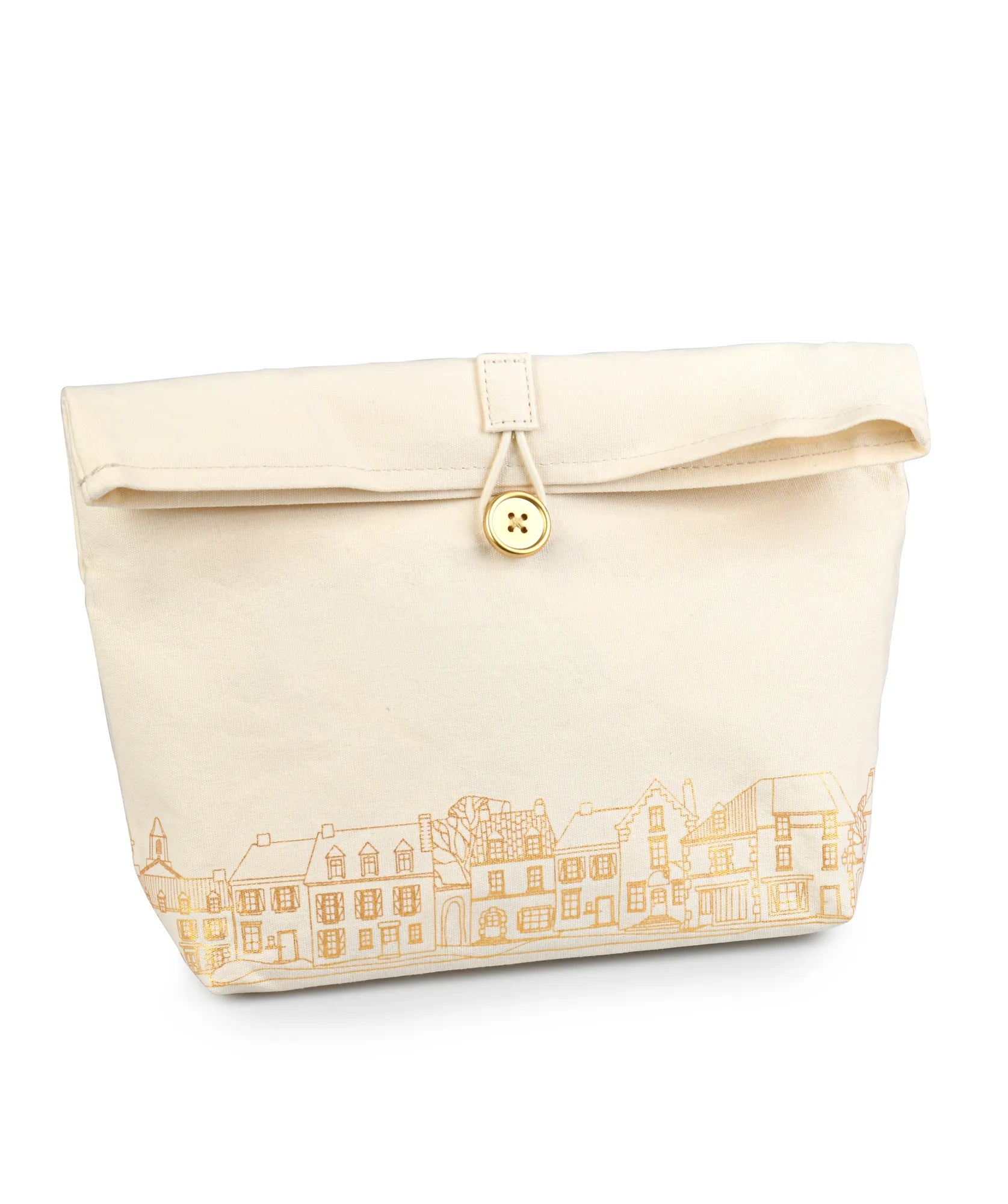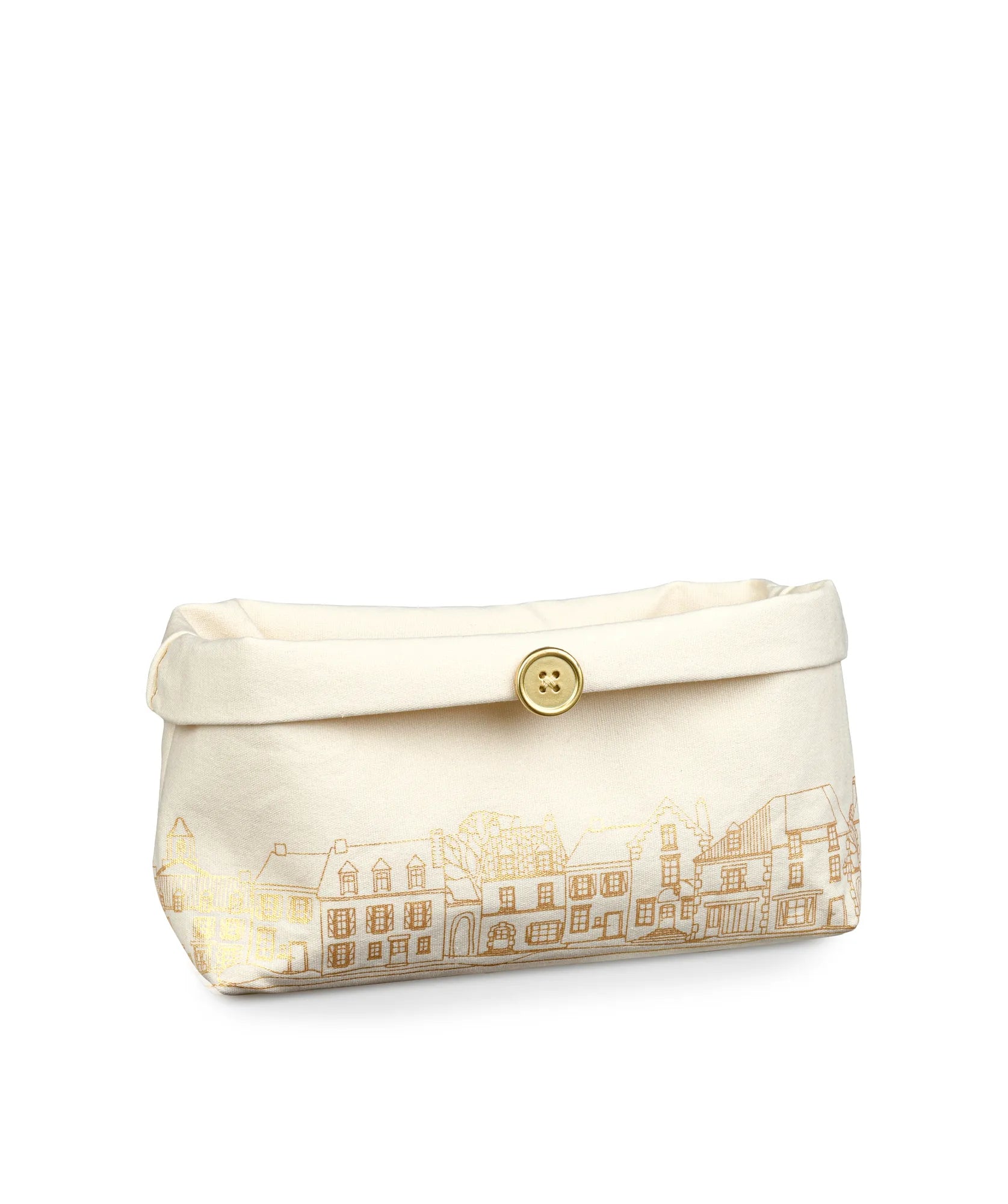 Inspirisana prirodom i prazničnim duhom La Gacilly sela, ova bež torbica od platna sa zlatnim detaljima pruža raskošan, ali prirodan način pakovanja poklona.