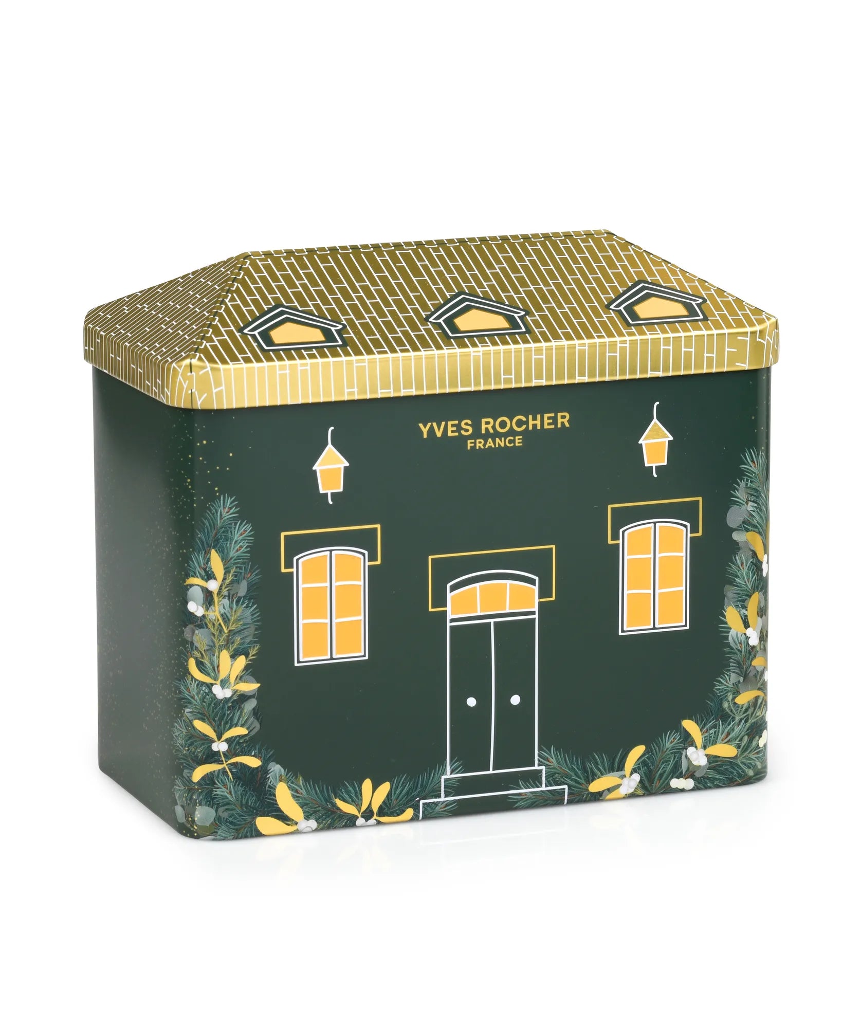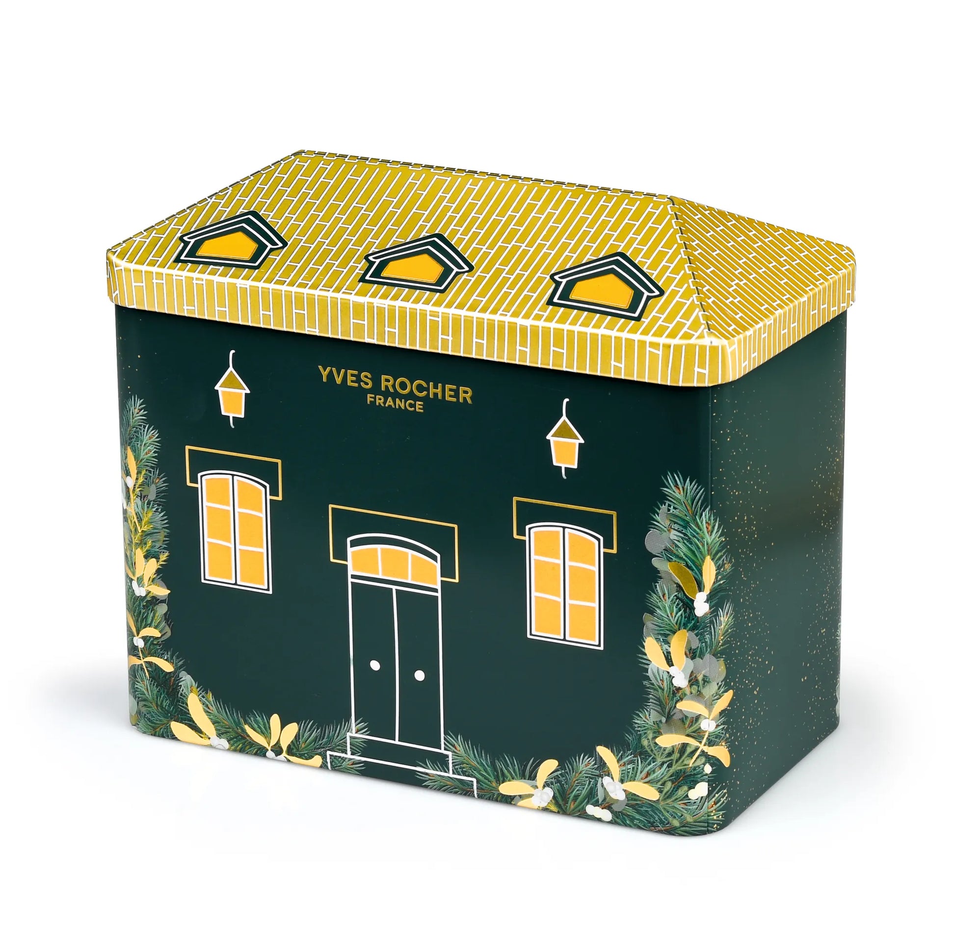 U tamnozelenim tonovima sa zlatnim prazničnim motivima, ova metalna kućica za pakovanje poklona osmišljena je po uzoru na La Gacilly – rodno mesto Yves Rochera.