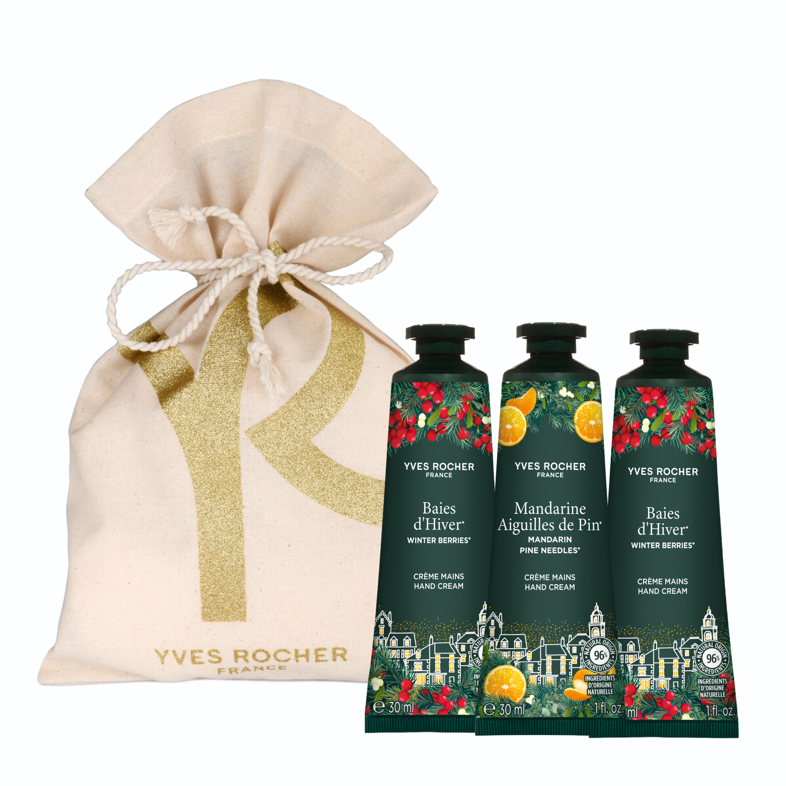 Limitirano izdanje Yves Rocher kolekcije 3 kreme za ruke donosi savršenu kombinaciju zimskih mirisa — tople, vanilaste note Zimskih bobica i iskričavu svežinu Mandarine i borovih iglica.