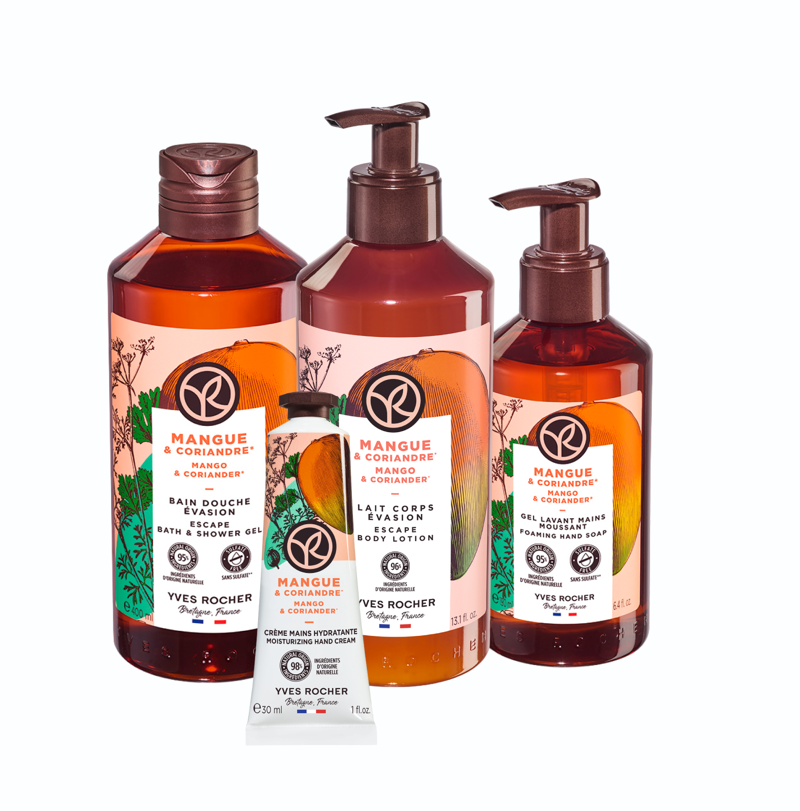 Uživajte u tropskoj harmoniji manga i korijandera, pažljivo odabranoj da osveži vaša čula i neguje kožu od glave do pete. Ovaj komplet pruža kompletan ritual nege – od tuširanja, pranja ruku i hidratacije, do parfemisanja tela i kose.