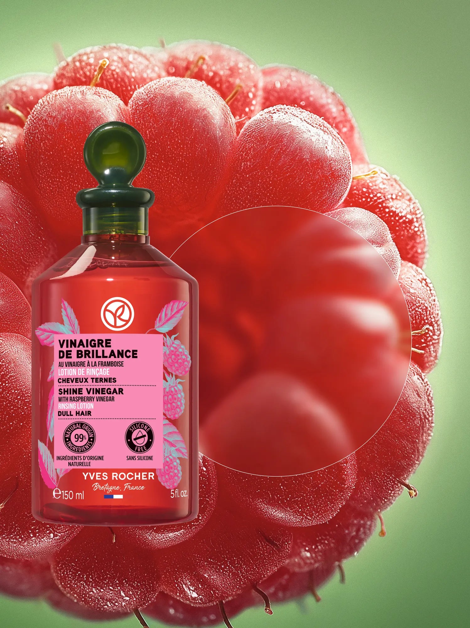 Zahvaljujući svom stručnom znanju o biljkama, istraživači Yves Rochera odabrali su sirće od maline zbog njegovih svojstava koja omekšavaju vodu i vraćaju kosi prirodan sjaj. Poznato još od davnina po svojoj efikasnosti, ono neutralizuje kamenac koji se taloži na vlasima pri svakom pranju, čineći kosu ponovo blistavom i punom života.